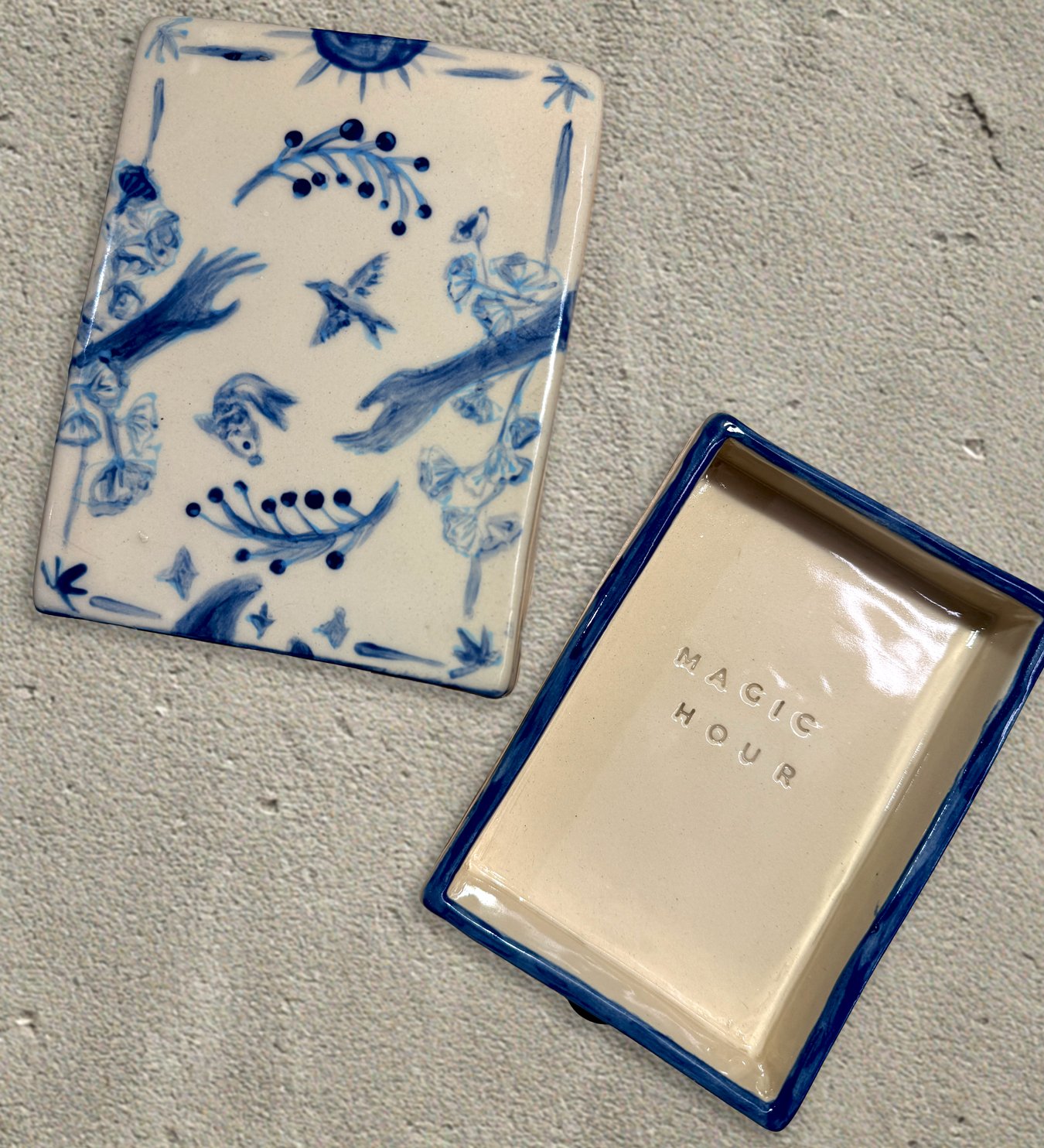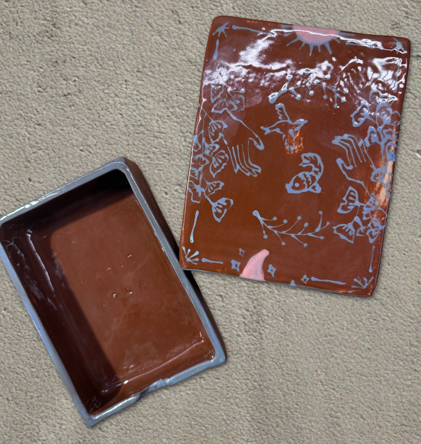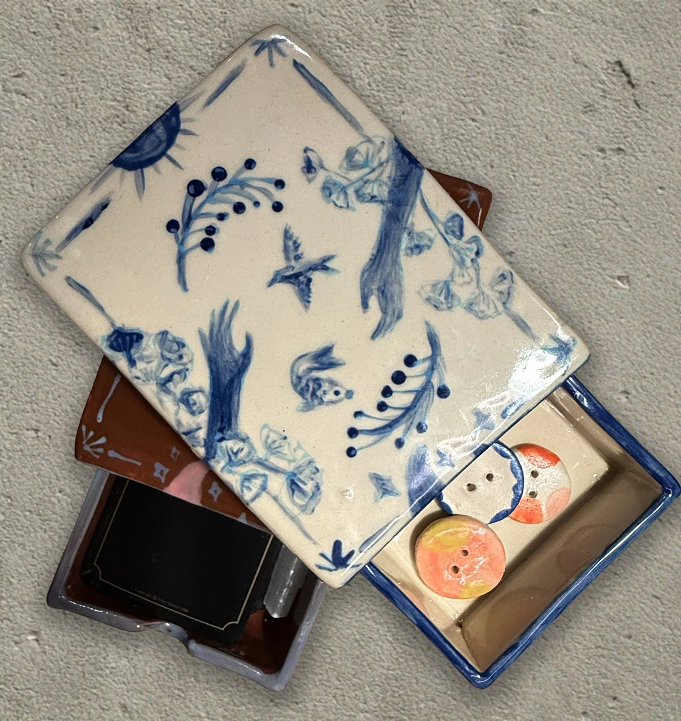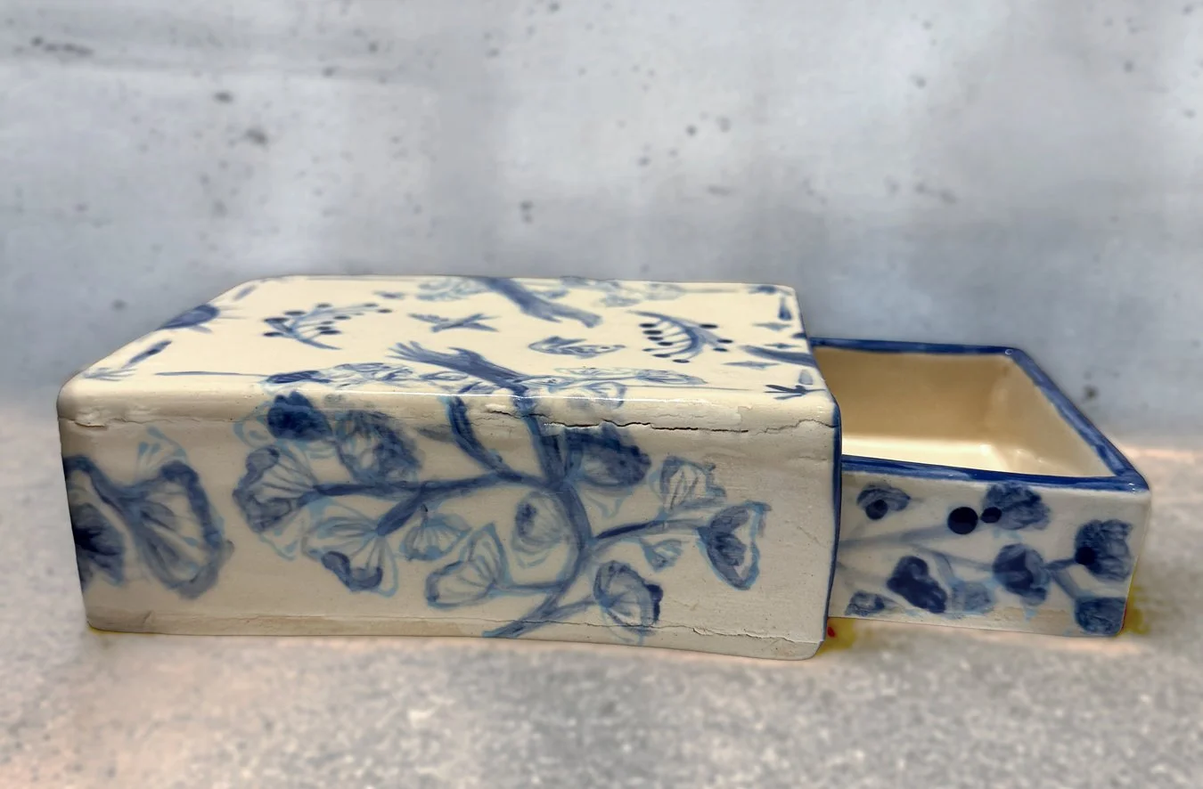 After bisque firing, a clear glossy glaze was added to the out side box and inside of the inner box. The rest were left in the matte terracotta engobe for texture contrast. Do you prefer the blue and white version or the terracotta?