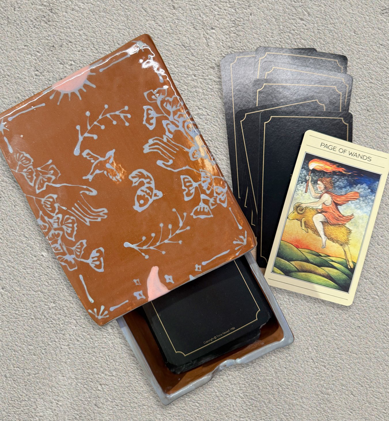 Found my old tarot deck from over 20 years ago. The deck is The Mythic Tarot by Juliet Sharman-Burke and Liz Greene, illustrated by Tricia Newell. They were kept in a wooden box. The lid had warped and was held close with an elastic band that was so brittle it fell apart to the lightest touch. Surprisingly, the cards were in great condition. I decided to make a new home for my deck out of clay… The idea seemed pretty straight forward. I envisioned a matchbox style box with a pull-out drawer. For an aspiring ceramist like myself, little did I know there were so many technical lessons to learn!
