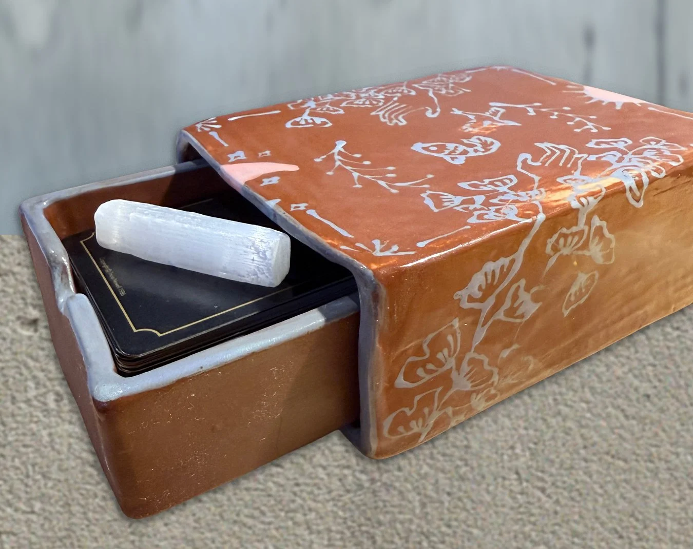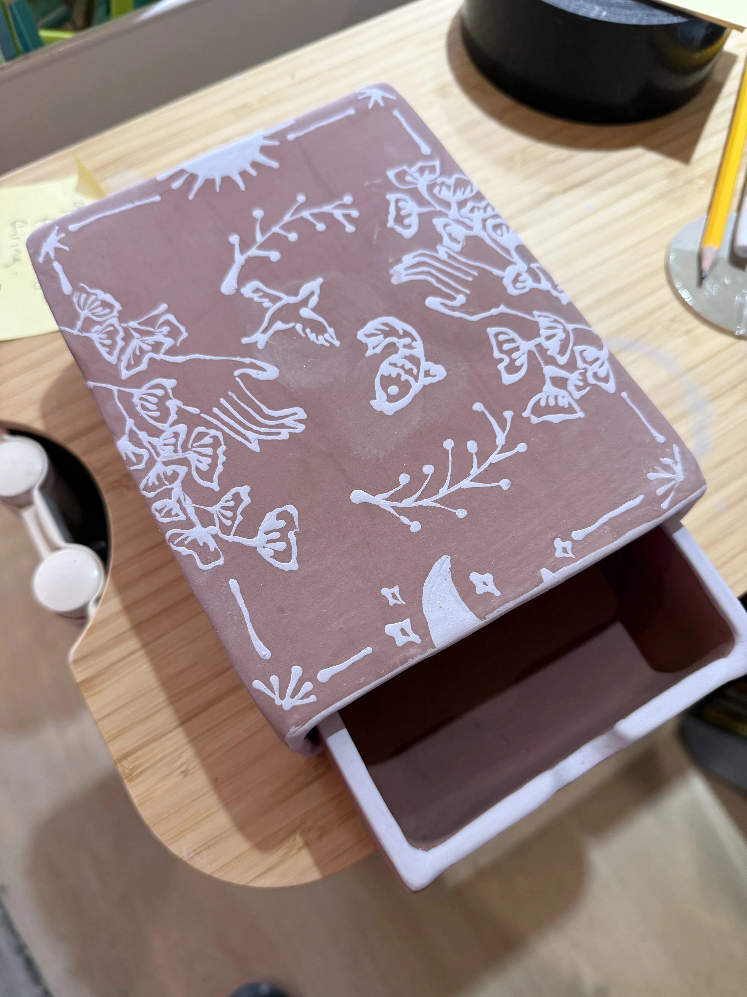 No more cracks and everything fits. There’s now extra room to add a crystal or two. I have a selenite that tucks in on the side of the deck. One technical part I can’t figure out yet is how to get rid of the warp on the top of the outer box opening. Some advice I was given: 1. compress more at slab stag. 2. assemble when the clay is dryer but still pliable, so before bone dry but maybe tail end of leather hard. Also, I think the engobe might have added to the warp because it was applied very thickly. If you have any helpful tips, I would love to hear about it! Please and thank you.