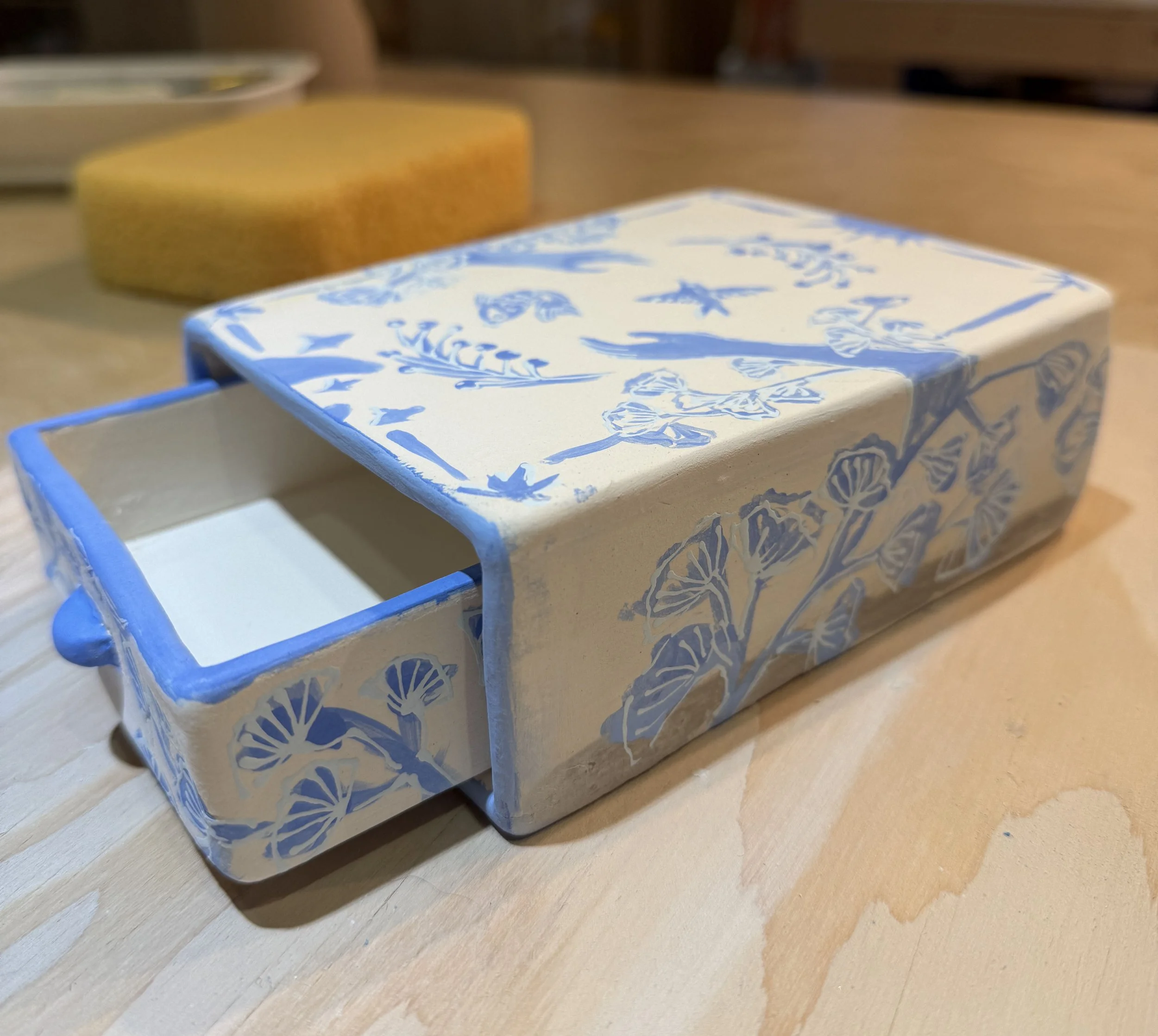 First try at my tarot box. Testing out the construction specs and original art work painting with blue underglaze on white clay.